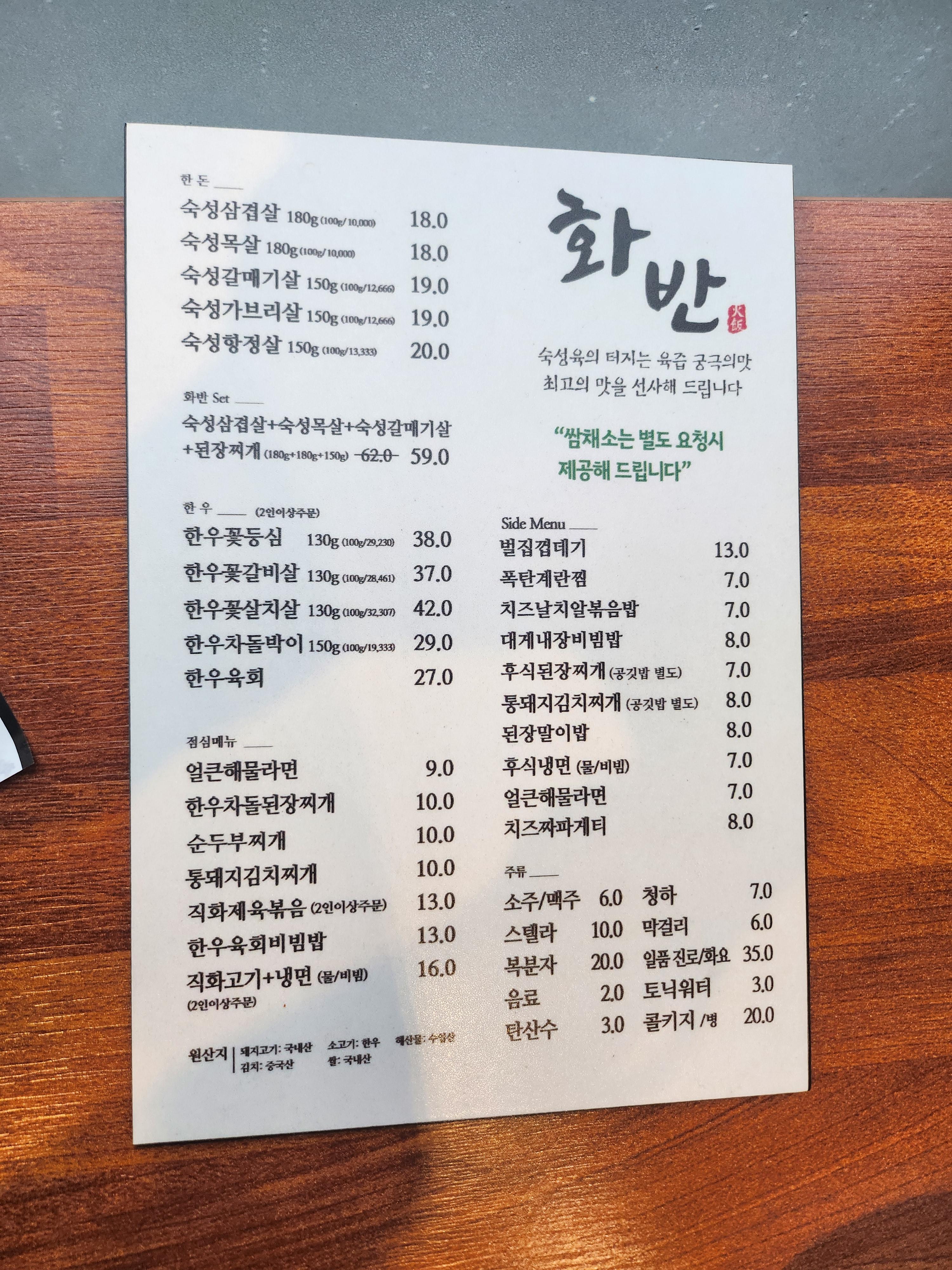 화반 set (숙성 삼겹살+숙성목살+숙성갈매기살+된장찌개)를 시키고 추가로 숙성삼겹살, 치즈짜파게티까지 해서 먹었을 때 양이 적당히 충분했다